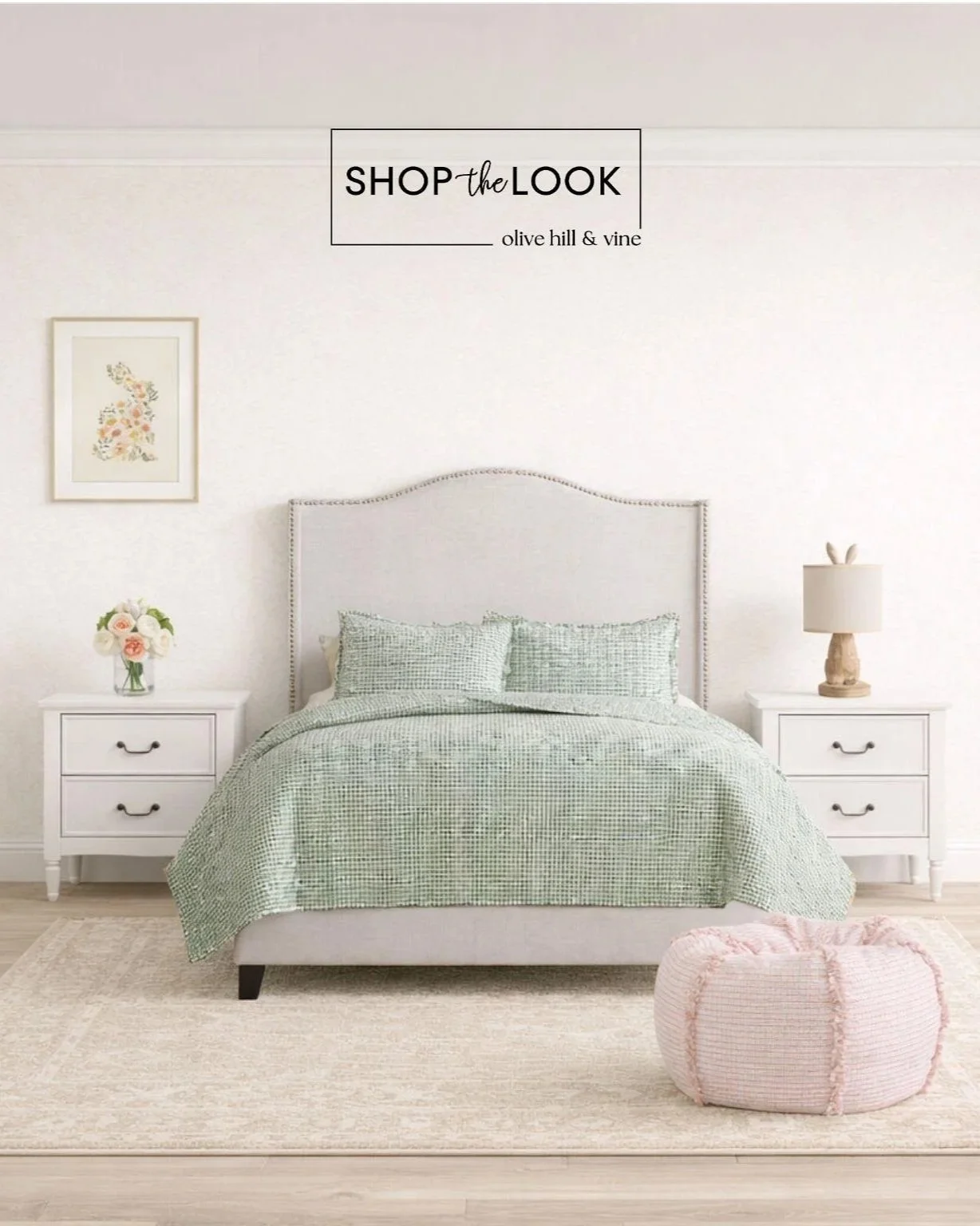 At the heart of this room is a calming mix of sage green, blush pink, and warm ivory. The sage gingham bedding introduces a gentle pattern while keeping the overall look grounded and serene. Paired with soft blush tones in the pouf and florals, the palette brings just enough warmth and personality to feel fresh for spring.